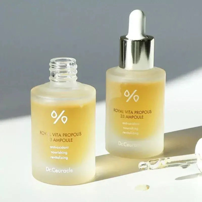 Ampula ar propolisu sejas ādas toņa uzlabošanai Dr.Ceuracle Royal Vita Propolis 33 Ampoule aktīvi atjauno ādu, uzlabo tās tekstūru, palīdz tai kļūt gludākai un atgūt elastību, padara vienmērīgāku sejas ādas toni. Līdzeklis izbalina nevēlamos pigmentācijas plankumus un samazina postaknes radītās sekas, kā arī novērš pigmentācijas plankumu veidošanos.