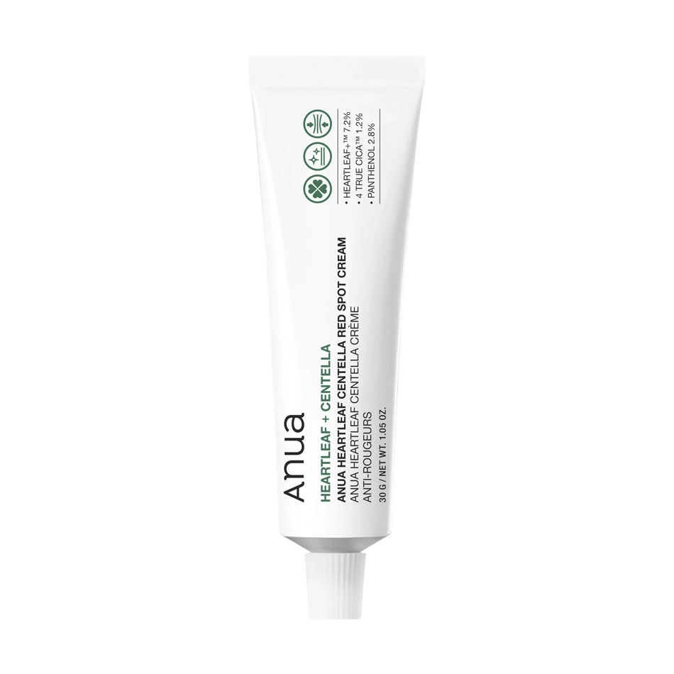 Lokāli uzklājams ādu nomierinošs krēms ar centellu un houtūniju Anua Heartleaf Centella Red Spot Cream efektīvi nomierina kairinātu ādu — mazina apsārtumu un niezi, atjauno epidermas dabisko aizsargbarjeru un uzlabo tās aizsargfunkcijas.