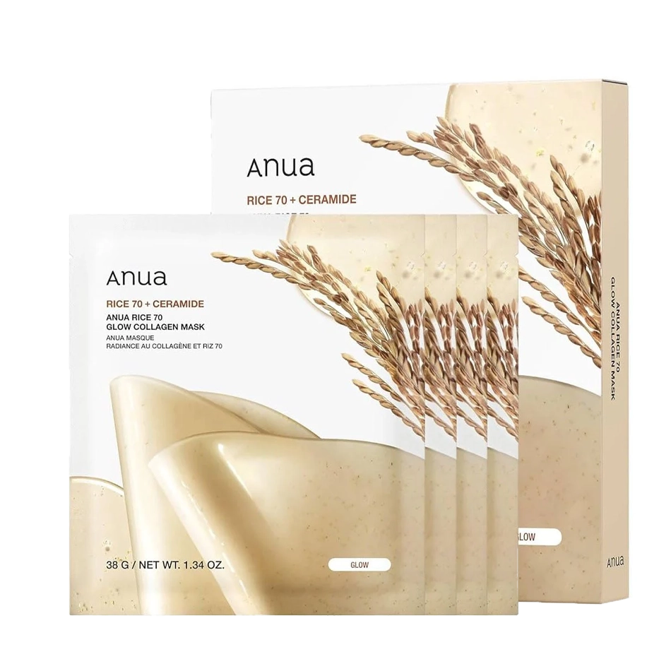 Hidrogela maska Anua Rice 70 Glow Collagen Mask atjauno, mitrina un izlīdzina ādu, kā arī piešķir glass skin efektu.