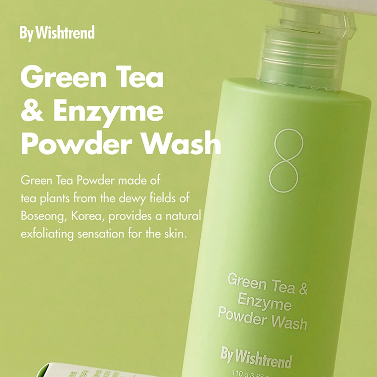 By Wishtrend Green Tea & Enzyme Powder Wash — enzīmu pulveris ar zaļo tēju un papaīnu, kas maigi noņem atmirušās ādas šūnas, attīra poras un piešķir ādai gludumu un svaigumu.