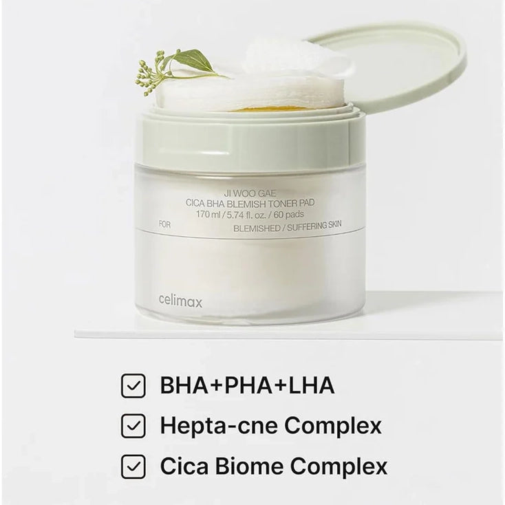 Iekaisumu novēršanai paredzētie pīlinga spilventiņi Celimax Ji Woo Gae Cica BHA Blemish Toner Pad noņem atmirušās ādas daļiņas, novērš komedonu veidošanos, pārmērīgu ādas taukošanos un izlīdzina ādas reljefu, tādējādi uzlabojot aknes skartās ādas izskatu.