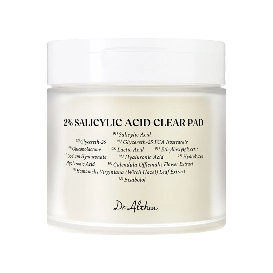 Dr. Althea 2% Salicylic Acid Clear Pad — spilventiņi ar 2% salicilskābi, tējas koku un burvjlazdu tīrai ādai bez iekaisumiem.