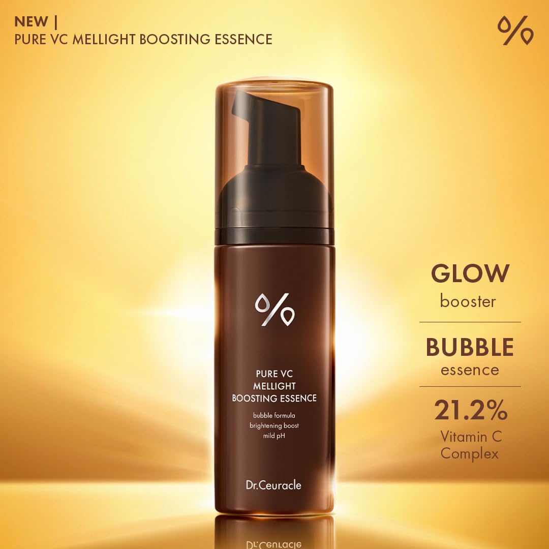 Burbuļu esence-būsteris Dr.Ceuracle Pure VC Mellight Boosting Essence novērš ādas blāvumu un balina pigmentācijas plankumus, padara vienmērīgāku ādas toni, veicina kolagēna izstrādi, kā arī uzlabo ādas tvirtumu un piešķir veselīgu mirdzumu.