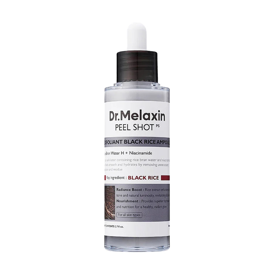 Pīlinga serums ar melno rīsu ekstraktu Dr.Melaxin Peel Shot Exfoliant Black Rice Ampoule nodrošina saudzīgu atmirušās ādas noņemšanu, izlīdzina ādas reljefu, cīnās ar ādas blāvumu un pigmentācijas plankumiem, kā arī piešķir dabisku mirdzumu.