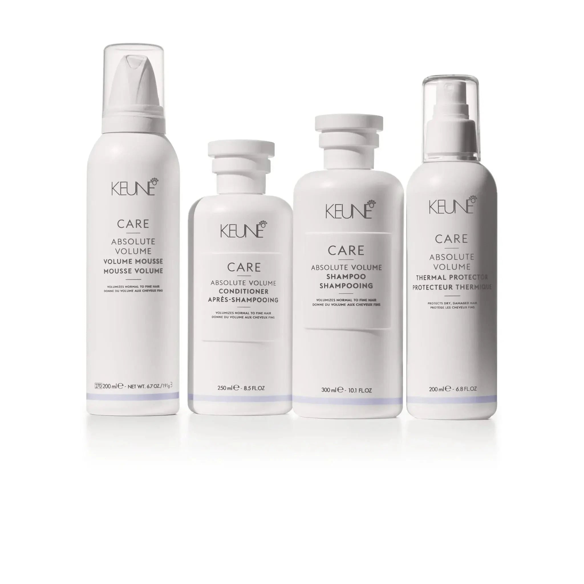 Keune CARE Absolute Volume Shampoo paredzēts smalkiem, plāniem un apjomu zaudējušiem matiem. Šampūna formula ir bagātināta ar kviešu proteīniem un šķidro keratīnu, kas palielina matu blīvumu un diametru, piešķirot tiem krāšņu apjomu un mirdzumu. Kviešu proteīni mitrina, aizsargā un baro matus, saglabājot krāsotu matu krāsas intensitāti un atjaunojot sašķeltos matu galiņus, tādējādi paildzinot to dzīvi un uzlabojot ārējo izskatu. Keratīns atjauno bojātos matus no iekšpuses, aizsargā no ārējās vides negatīvās ietekmes, kā arī aizkavē mitrumu matu iekšienē un novērš matu galiņu šķelšanos.