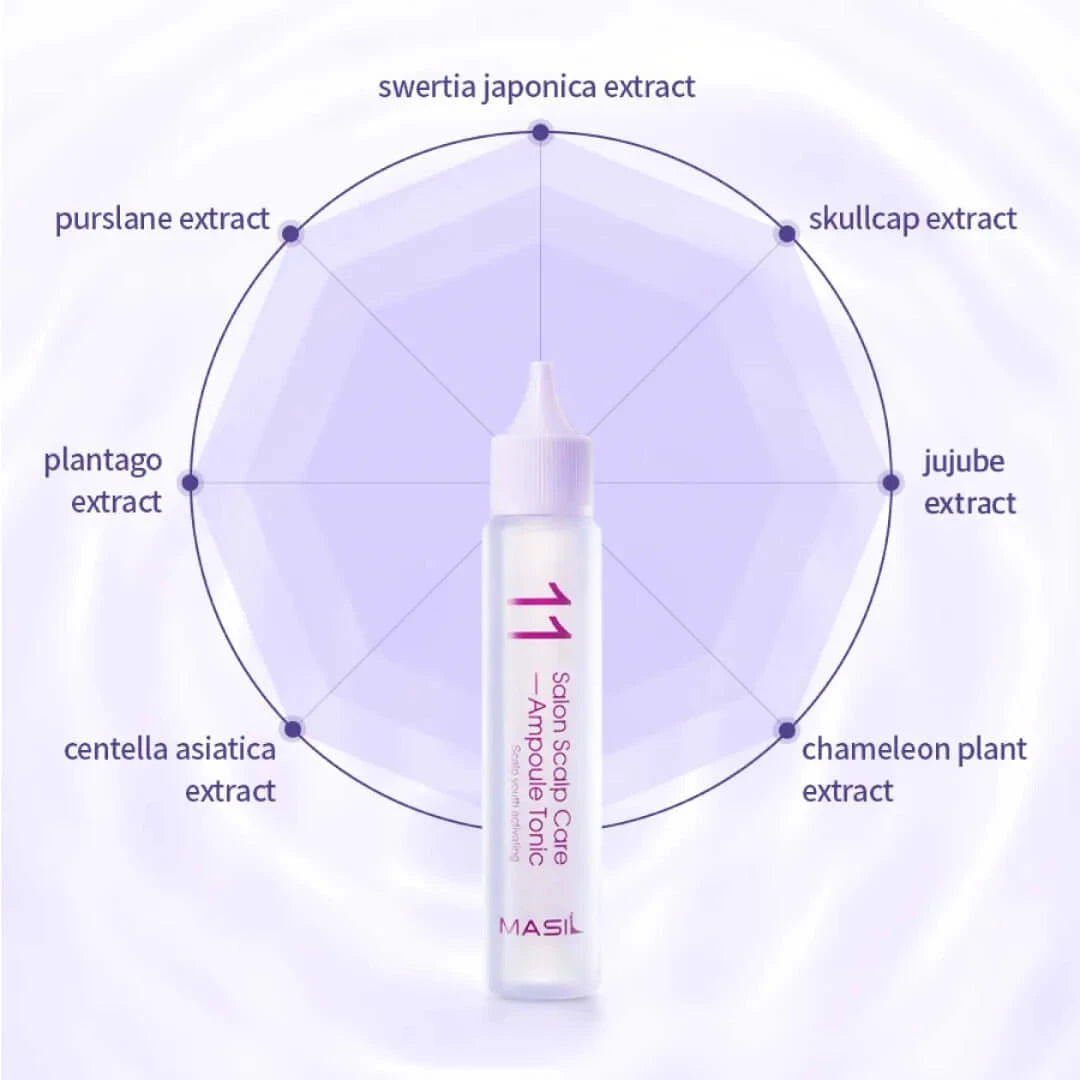 Atsvaidzinošs ampulas toniks Masil 11 Salon Scalp Care Ampoule Tonic nomierina kairināto galvas ādu, novērš niezi un veicina iekaisumu dzīšanu. Novērš nepatīkamu aromātu, paildzina matu svaigumu un tīrību.