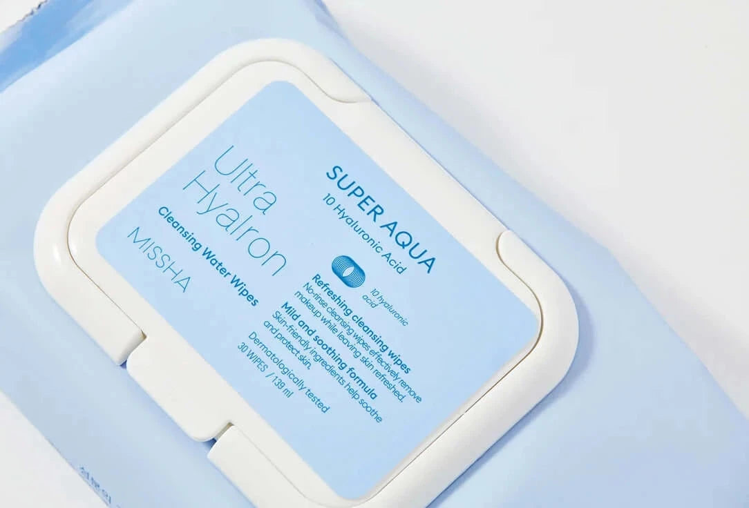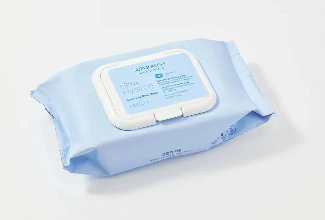 Missha Super Aqua Ultra Hyalron Cleansing Water Wipes – attīrošās salvetes ar hialuronskābi ir ērts un drošs līdzeklis kosmētikas noņemšanai. Tās rūpīgi noņem pat ūdensnoturīgo kosmētiku, mitrina, bagātina ar vitamīniem, kā arī ir piemērotas visiem ādas tipiem (tostarp, jutīgai un problemātiskai ādai).