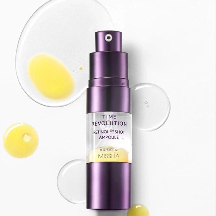MISSHA Time Revolution Retinol 500 Shot Ampoule — intensīva seruma ampula ar retinolu grumbu mazināšanai, ādas tekstūras izlīdzināšanai un jauneklīga mirdzuma atjaunošanai.