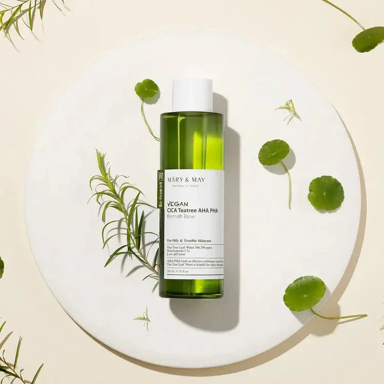 Toniks Mary&May Vegan CICA Tea Tree AHA PHA Toner nomierina un atsvaidzina, intensīvi mitrina un mīkstina, saudzīgi noņem raga slāni, sašaurina paplašinātas poras, kā arī novērš komedonu un melno punktiņu veidošanos.
