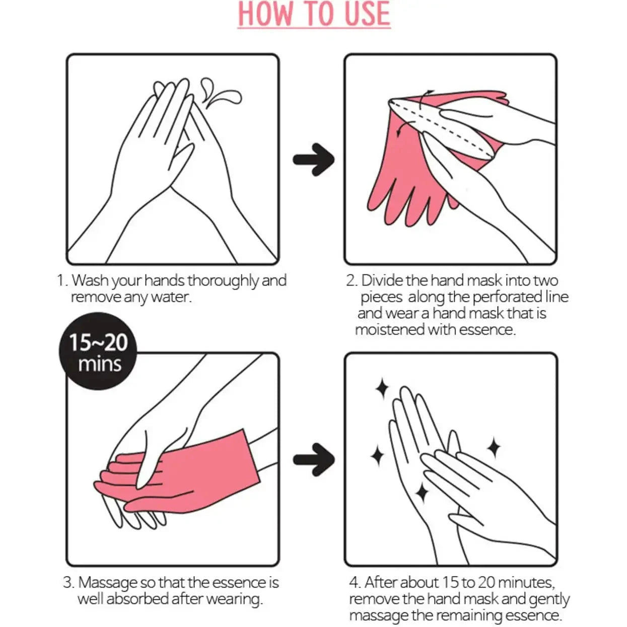 - Pēc roku maskas lietošanas, lūdzu, iemasējiet rokās atlikušo esenci, lai tā iesūcas ādā.