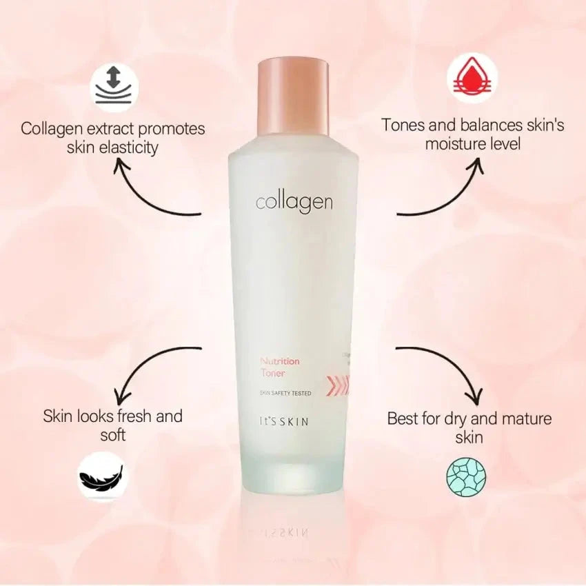 Sejas tonika It`s Skin Collagen Nutrition Toner pamatā ir hidrolizēts kolagēns. Toniks lieliski baro ādu, atjauno tās tvirtumu un elastību. Lieliski piemērota sausai un dehidrētai ādai. Lietošanas rezultātā sejas krāsa ievērojami uzlabojas. Jūs izskatāties svaigi un atpūtusies!