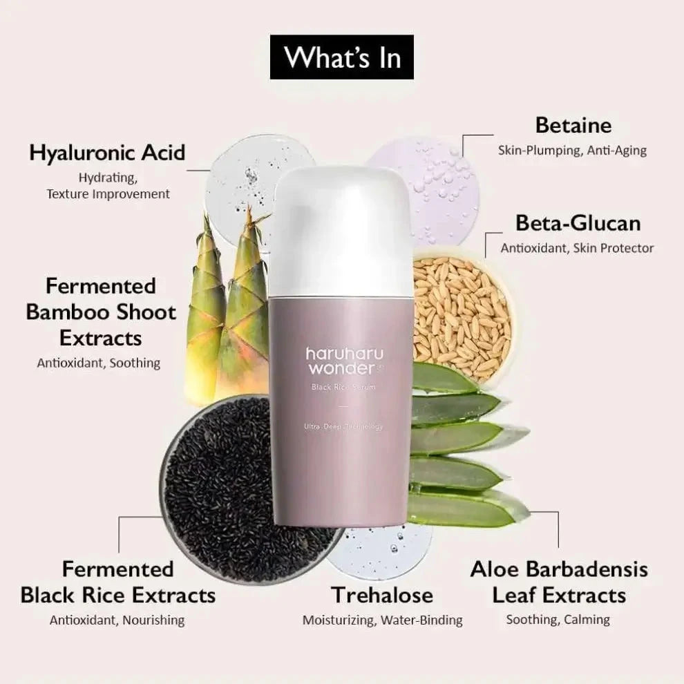 Haruharu Wonder Black Rice Serum – antioksidantu serums ar melniem rīsiem, kas nodrošina kompleksu iedarbību uz ādu: intensīvi mitrina, cīnās ar ādas blāvumu, uzlabo sejas krāsu un palēnina ādas novecošanos.