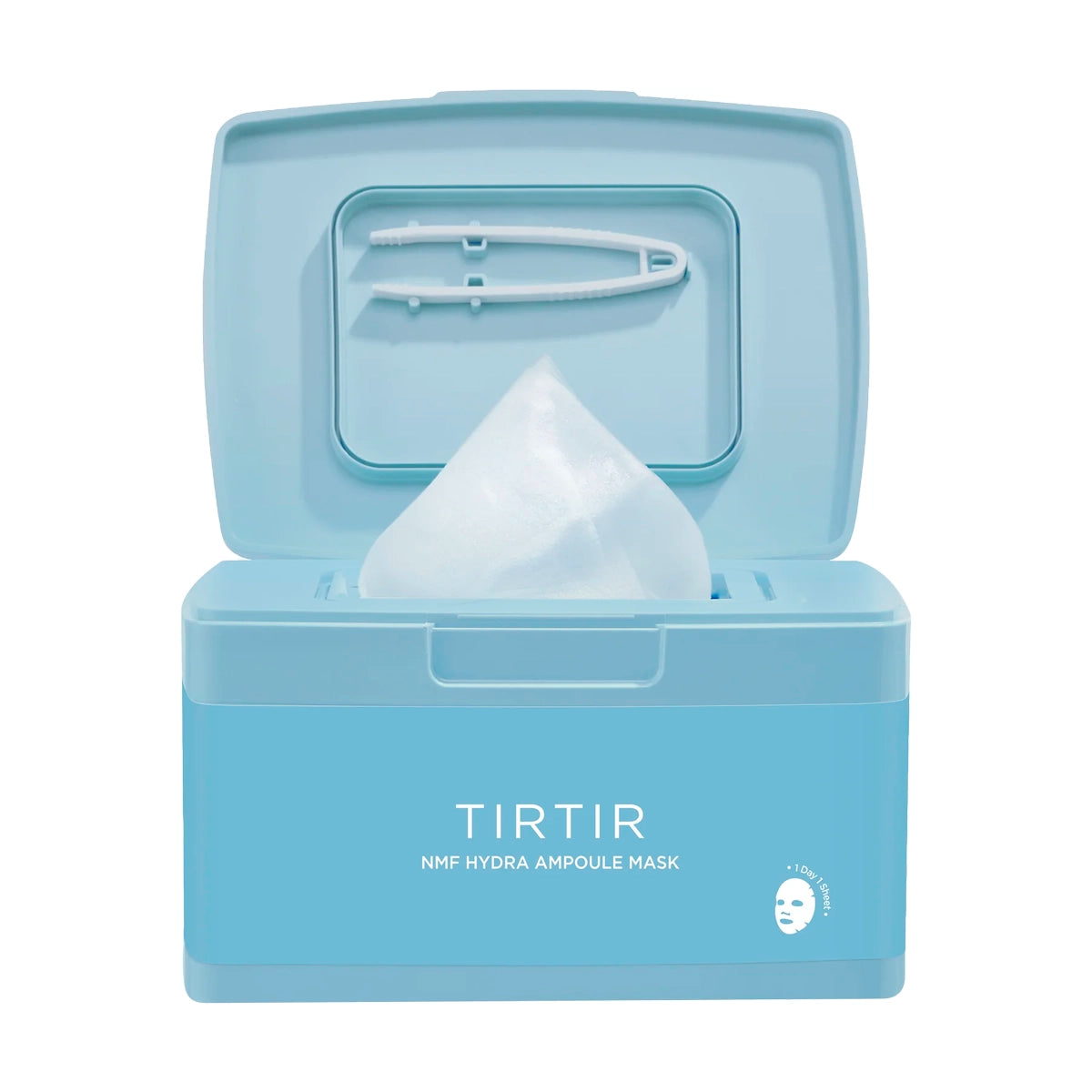 TIRTIR NMF Hydra Ampoule Mask — intensīvi mitrinoša auduma maska ar 8 hialuronskābju formu kompleksu un aminoskābēm, kas atjauno ādas līdzsvaru un elastību.