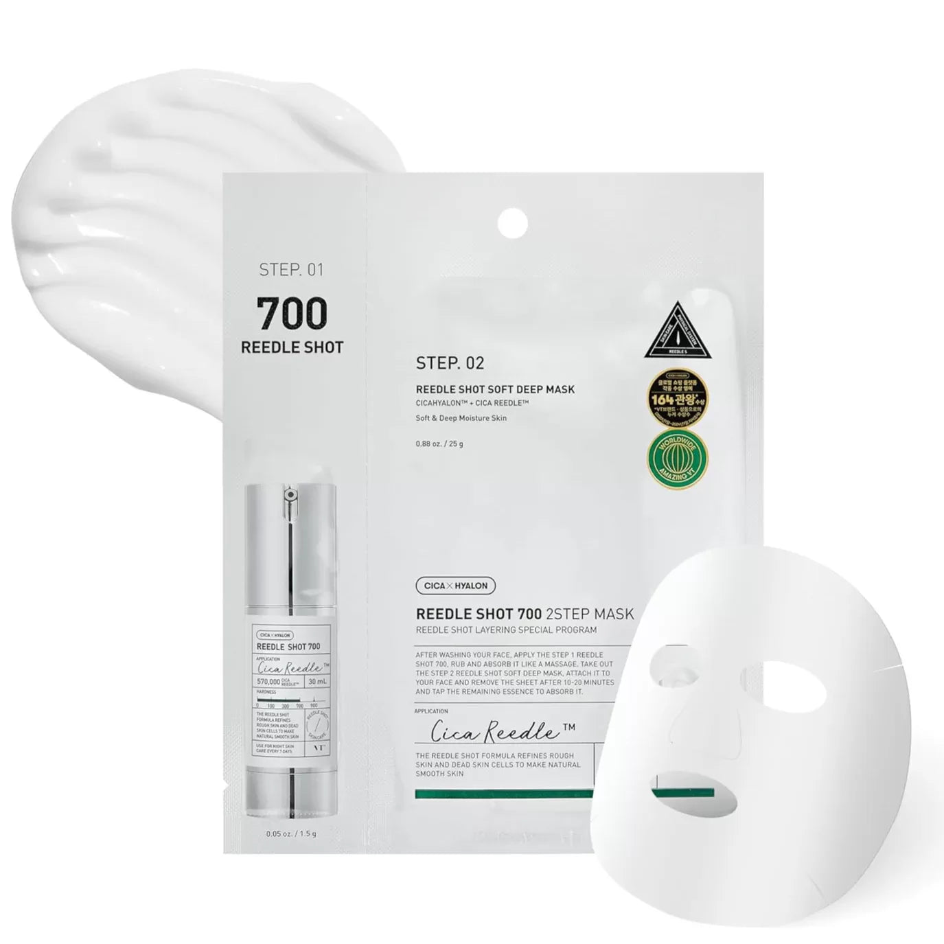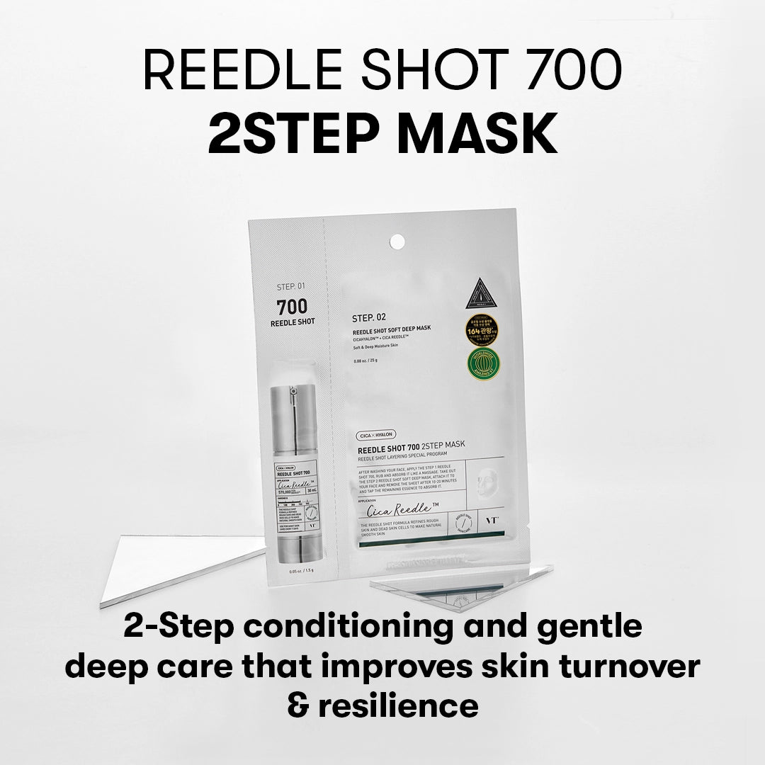 Divu tekstūru maska VT Cosmetics Reedle Shot 700 2 Step Mask — tas ir intensīvs būsteris, kas piemērots ādas kopšanai mājas apstākļos, kuru veido 2 posmi. Masku veido serums-būsteris Reedle Shot, kura pamatā ir augstas koncentrācijas mikroadatas, kā arī auduma pamatne: abi ādas kopšanas posmi pastiprina viens otra iedarbību.