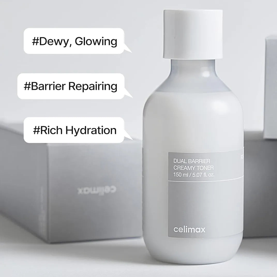 Тонер Celimax Dual Barrier Creamy Toner восстанавливает сухую и тонкую кожу, спасая в холодное время года: смягчает и увлажняет, питает, повышает защитные функции, предотвращает сухость и шелушение.