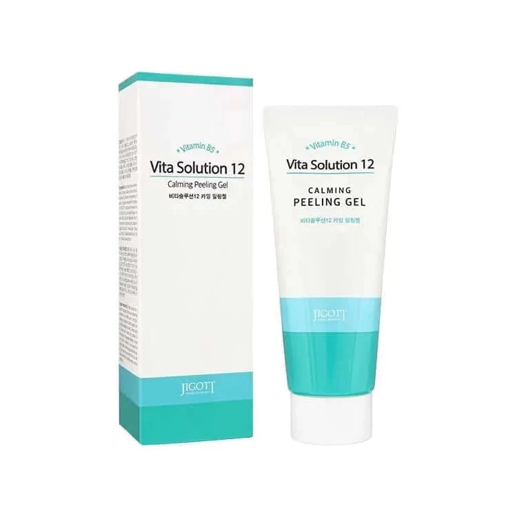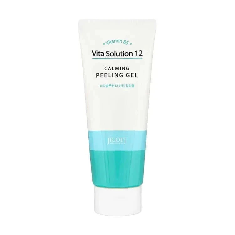 Jigott Vita Solution 12 Calming Peeling Gel - Nomierinošs pīlinga gēls sejai satur dažādus augu ekstraktus un Vitamīnu B5, kas nodrošina mitrumu un barības vielas nogurušai un saspringtai sejas ādai. Sastāvā esošā smiltsērkšķu ogu eļļa (0,1%) un smiltsērkšķu ogu ekstrakts (0,1%) piešķir ādai vitalitāti. Celulozes daļiņas attīra atmirušās ādas šūnas un netīrumus porās, kā arī mitrina sejas ādu.