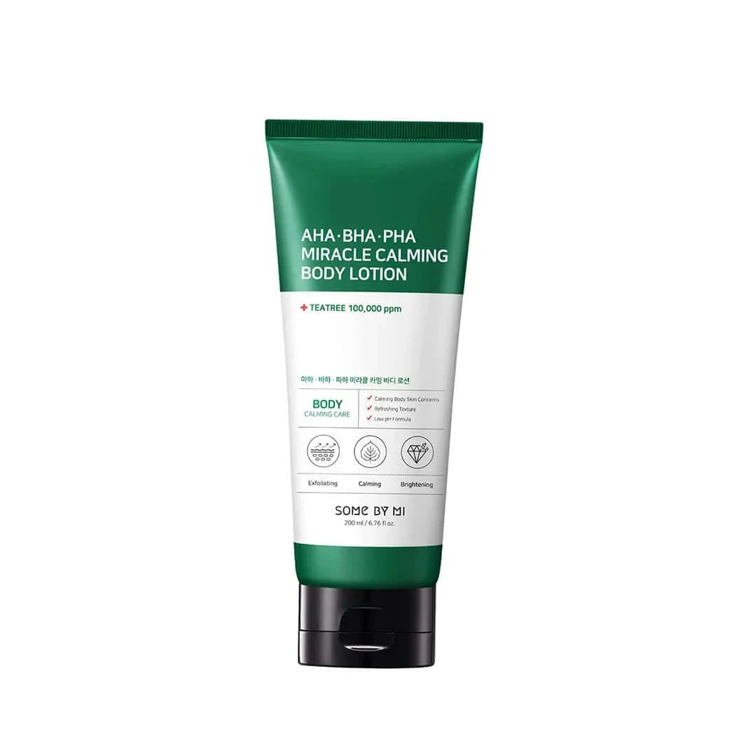Some By Mi AHA-BHA-PHA Miracle Calming Body Lotion — содержит запатентованный комплекс Truecica, включающий экстракт центеллы азиатской 92%, азиатикозид, мадекассосид, мадекассовую и азиатиковую кислоту — мощные компоненты против акне, высыпаний и повреждений эпидермиса.