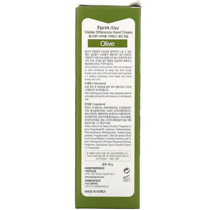 Farm Stay Visible Difference Hand Cream Olive - Это увлажняющий крем для рук с экстрактом оливы. Он разглаживает и увлажняет кожу, насыщает её витаминами, снимает напряжение и усталость, устраняет чувство стянутости и дискомфорта.