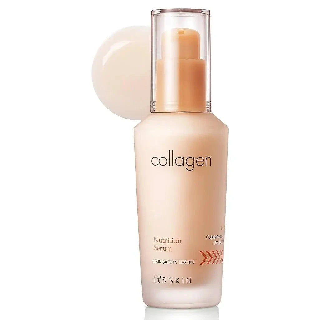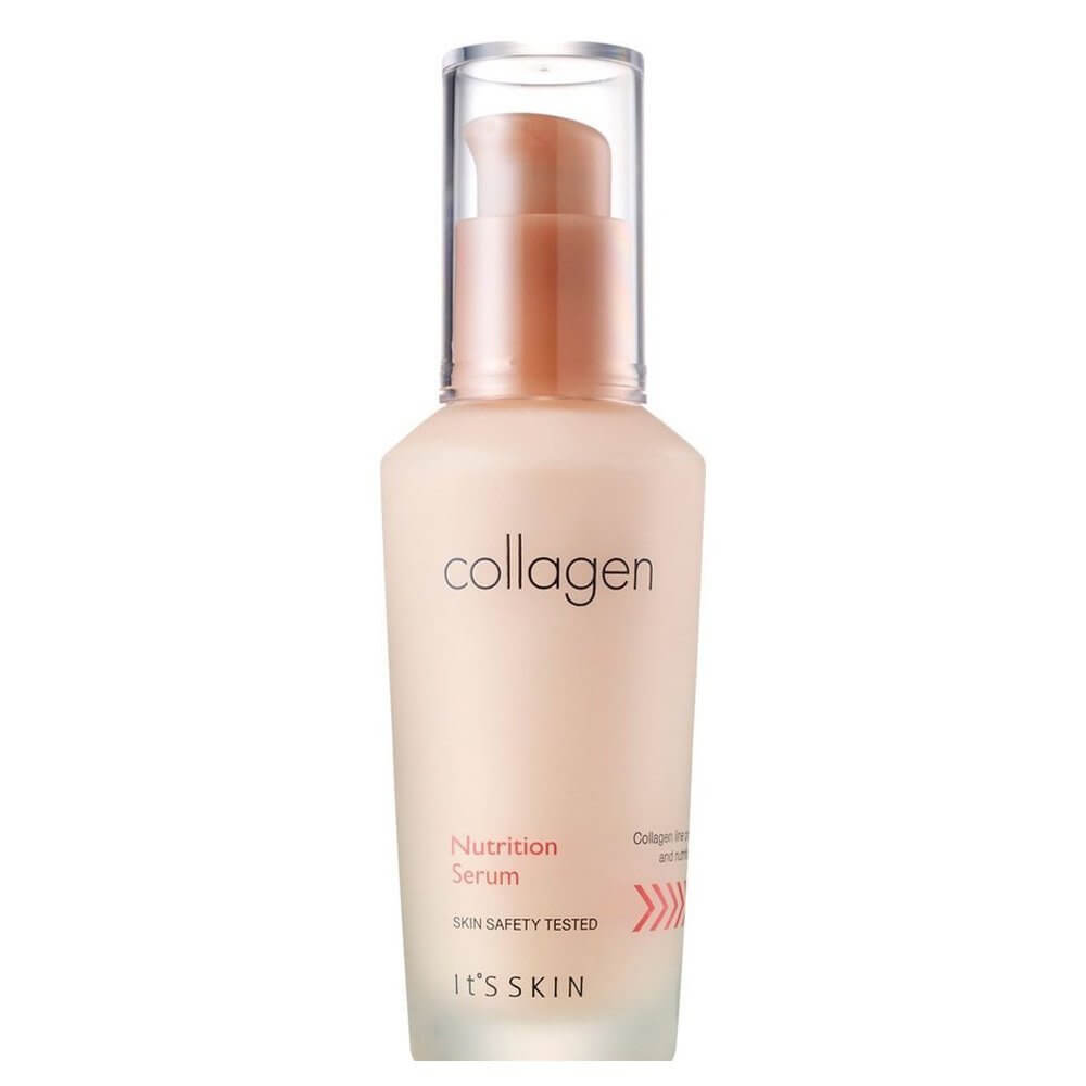 Сыворотка обеспечивает лифтинговый эффект, делает кожу упругой и гладкой. Сыворотка It's Skin Collagen Nutrition Serum содержит коллаген (8000 мг), экстракт адониса, экстракт брусники, экстракт солода. Линия обогащенная активным витаминным комплексом, быстро впитывается кожей, активизируя процесс обновления клеток. Повышает эластичность и упругость кожи, смягчает и увлажняет ее, стимулирует микроциркуляцию и разглаживает мелкие морщины. Экстракт адониса содержит сапонины, адомидозид, адониловая кислота, хиноны, фитостерин, спиртадонит, кумарины, сердечные гликозиды. Экстракт брусники, который прекрасно тонизирует кожу, насыщает её витаминами, улучшает обмен веществ и укрепляет стенки клеток эпидермиса. Содержащийся в экстракте витамин C действует как антиоксидант, придавая коже упругость, а витамин A помогает в борьбе с угревой сыпью. Великолепно тонизирует кожу, делая ее упругой, насыщает кожу витаминами, улучшает обмен веществ и укрепляет клетки эпидермиса. Экстракт солода оказывает благоприятное действие на кожу, устраняет кожную сыпь и гнойничковые воспаления, активизирует обменные процессы и регенерацию клеток, повышает тонус и степень увлажнения. Сыворотка сохраняет мягкость, увлажнение и упругость кожи, быстро проникает в кожу, не оставляя липкого эффекта.