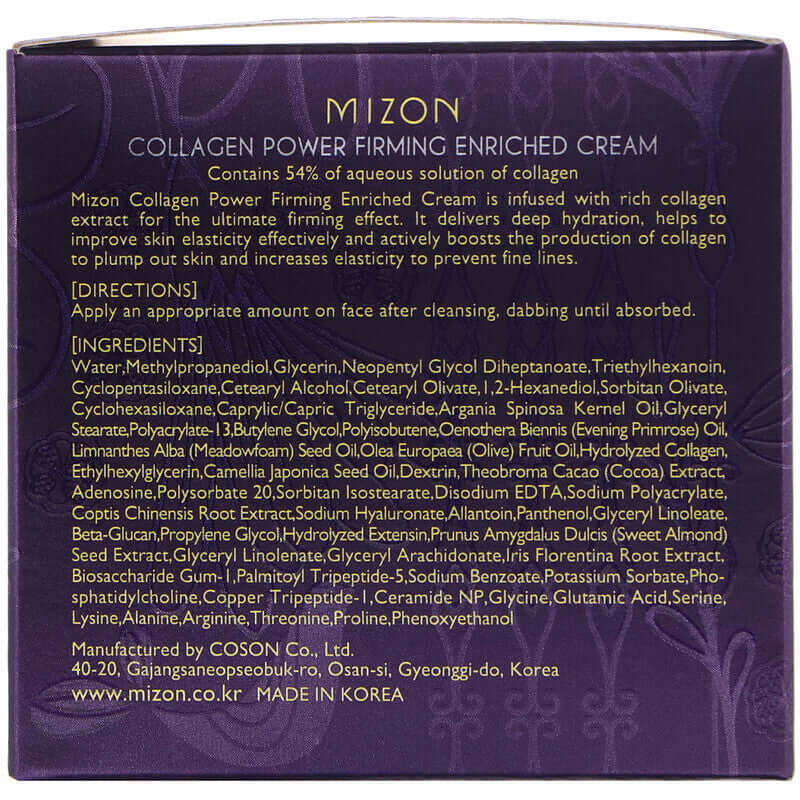 Mizon Collagen Power Firming Enriched Cream — питательный крем для лица с коллагеном, идеально подходящий для глубокого питания, восстановления и омоложения кожи. Крем эффективно борется с признаками увядания: морщинами, кожными заломами, потерей тонуса и обезвоженностью. Благодаря гидролизату коллагена, крем обеспечивает лифтинг-эффект, увеличивает упругость и эластичность кожи. Формула крема также обогащена гиалуроновой кислотой, аденозином, экстрактами лечебных растений и натуральными маслами для комплексного ухода за кожей.