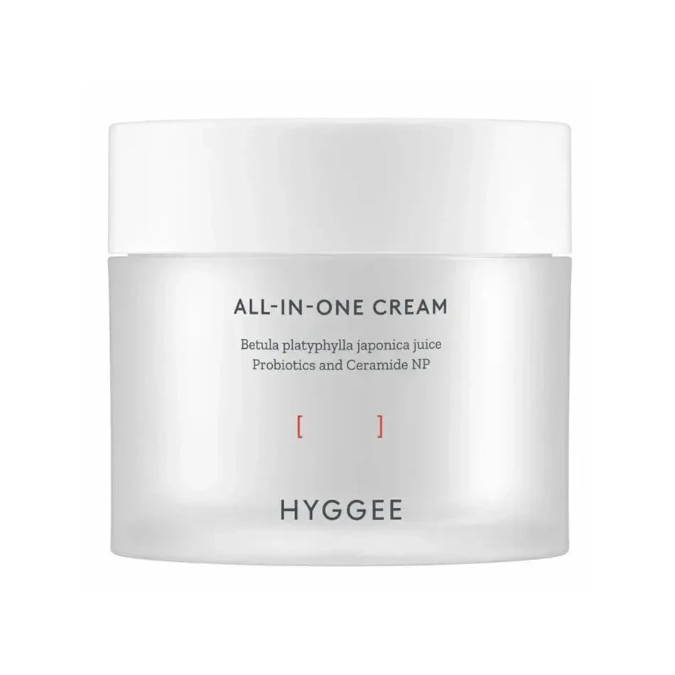 HYGGEE All-In-One Cream — универсальный крем для лица с лактобактериями, который активно увлажняет и питает кожу, устраняет сухость и признаки обезвоживания. Крем укрепляет защитные функции кожи, восстанавливает гидролипидный барьер и выравнивает тон, освежая кожу и поддерживая её молодость. Подходит как база под макияж.