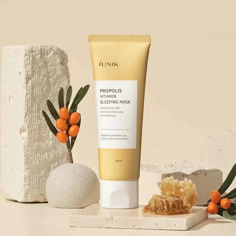 iUnik Propolis Vitamin Sleeping Mask — витаминная ночная маска с прополисом, которая питает и увлажняет кожу, устраняет сухость и шелушения, улучшает тонус и цвет лица. Содержит 16% прополиса с антибактериальными свойствами, успокаивает раздражённую кожу, помогает в борьбе с воспалениями. Витаминный комплекс в составе маски тонизирует кожу, укрепляет защитные функции эпидермиса.