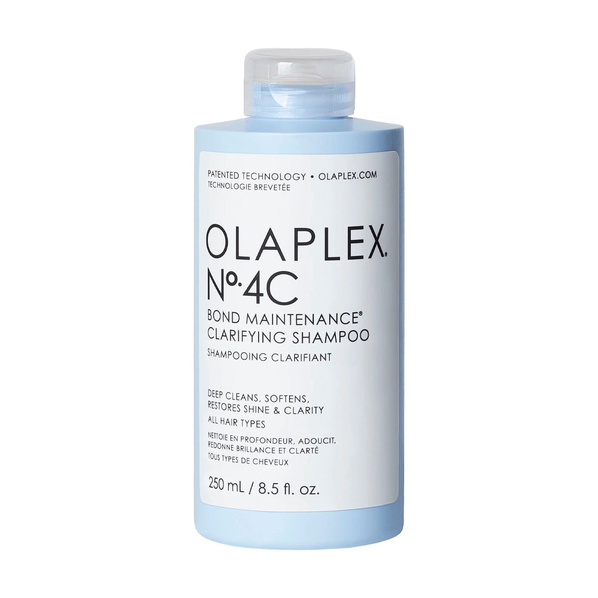 Olaplex No.4C Bond Maintenance Clarifying Shampoo — maigs, bet efektīvs attīrošs šampūns, kas noņem uzkrātos netīrumus un palīdz atjaunot matu svaigumu, mīkstumu un spīdumu.